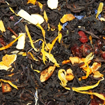 Черный чай с добавлением барбариса, изюма, цветов василька, цветов подсолнуха, цедры апельсина, кусочков яблок и красной смородины. Заваривать 3-4 минуты при температуре 95°С.