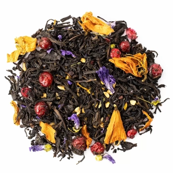 Купаж индийского и цейлонского черного чая с добавлением ягод красной смородины, василька, сафлора. Напиток получается терпкий с легкой кислинкой и ягодным ароматом. Заваривать 2-3 минуты при температуре 95°С.